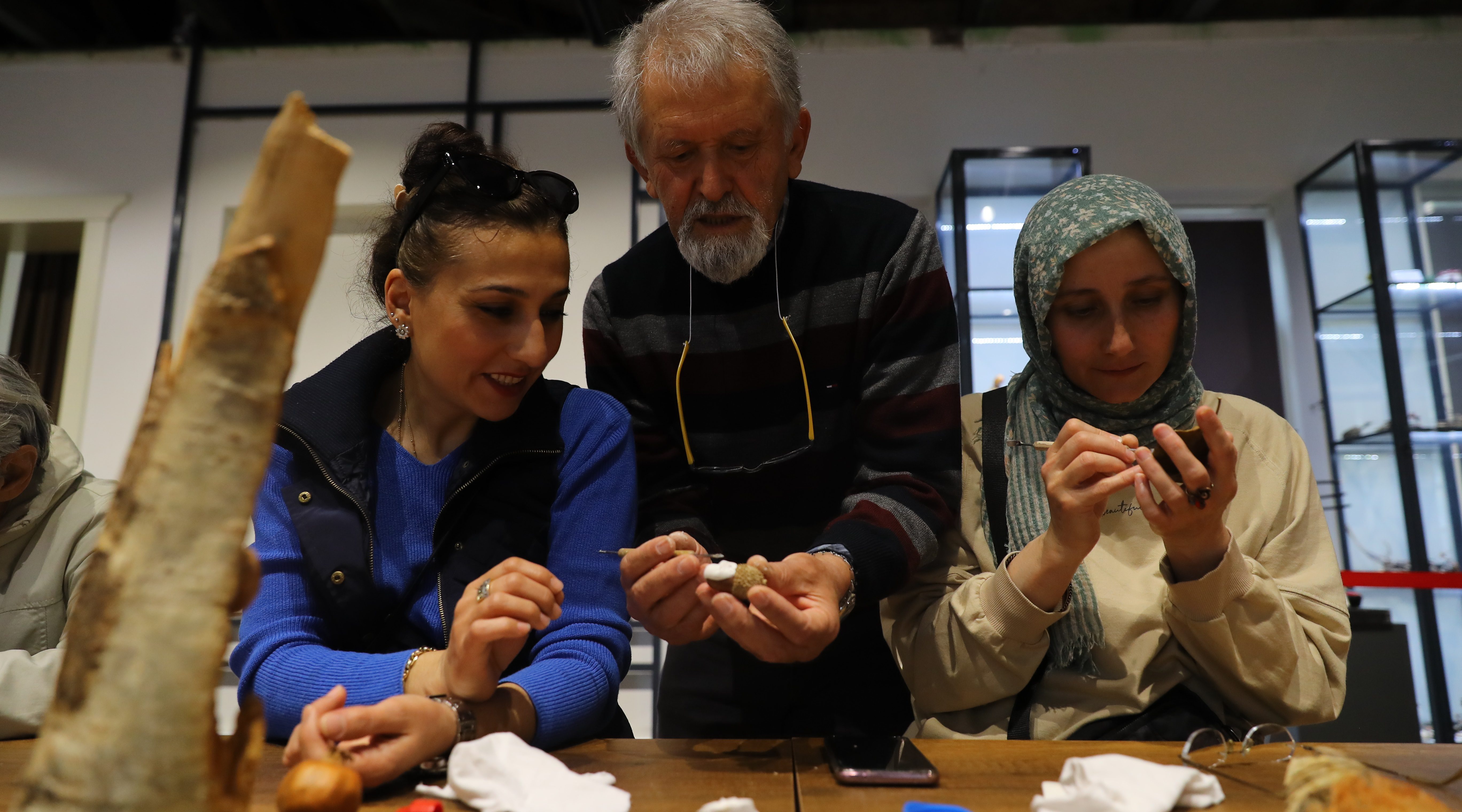 atölye eğitimi kapsamında ağaç, yaprak, odun, ahşap, taş ve benzeri objelerin nasıl heykel sanatına dönüştürüleceğini anlattı.