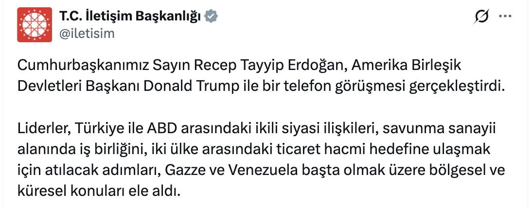 Cumhurbaşkanlığı İletişim Başkanlığı, Erdoğan-Trump görüşmesiyle ilgili olarak yayımladığı mesajda "Liderler, Türkiye ile ABD arasındaki ikili siyasi ilişkileri, savunma sanayii alanında iş birliğini, iki ülke arasındaki ticaret hacmi hedefine ulaşmak için atılacak adımları, Gazze ve Venezuela başta olmak üzere bölgesel ve küresel konuları ele aldı," ifadelerini kullandı.