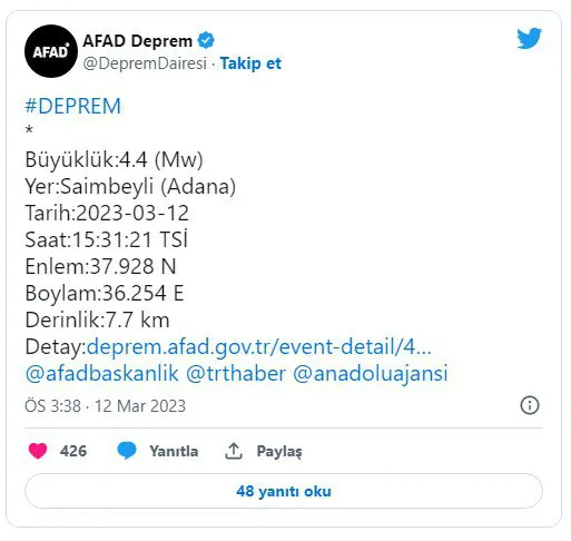 Afet ve Acil Durum Yönetimi Başkanlığı (AFAD) verilerine göre Adana’nın Saimbeyli ilçesinde saat 15:31’de 4.4 büyüklüğünde bir deprem oldu.