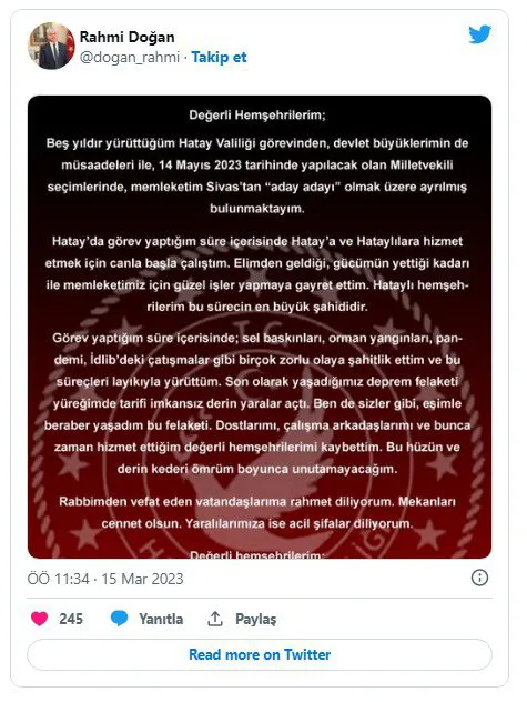 *Değerli hemşehrilerim beş yıldır yürüttüğüm Hatay valiliği görevinden, devlet büyüklerimin de müsaadeleriyle 14 Mayıs 2023 tarihinde yapılacak milletvekili seçimlerinde, memleketim Sivas’tan aday adayı olmak üzere ayrılmış bulunmaktayım.