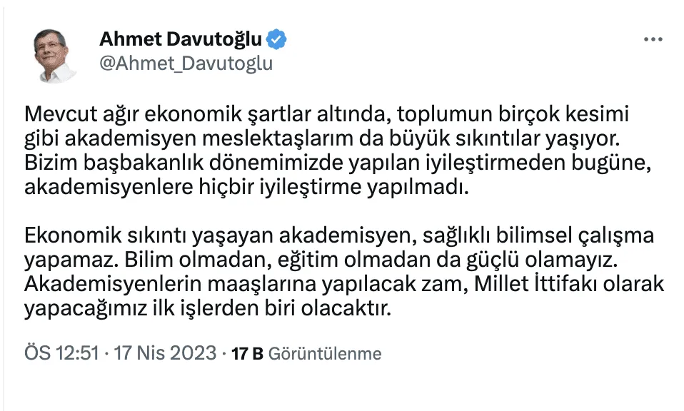 Davutoğlu Twitter hesabından yaptığı paylaşımda, 'Mevcut ağır ekonomik şartlar altında, toplumun birçok kesimi gibi akademisyen meslektaşlarım da büyük sıkıntılar yaşıyor. Bizim başbakanlık dönemimizde yapılan iyileştirmeden bugüne, akademisyenlere hiçbir iyileştirme yapılmadı. Ekonomik sıkıntı yaşayan akademisyen, sağlıklı bilimsel çalışma yapamaz. Bilim olmadan, eğitim olmadan da güçlü olamayız. Akademisyenlerin maaşlarına yapılacak zam, Millet İttifakı olarak yapacağımız ilk işlerden biri olacaktır.' ifadesini kullandı.