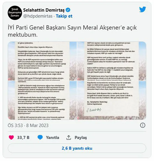 Tutuklu eski HDP eş genel başkanı Selahattin Demirtaş, İYİ Parti Genel Başkanı Meral Akşener’e açık mektup yayınladı: “Size hak olan müzakere siyaseti HDP’ye niye hak değil?”