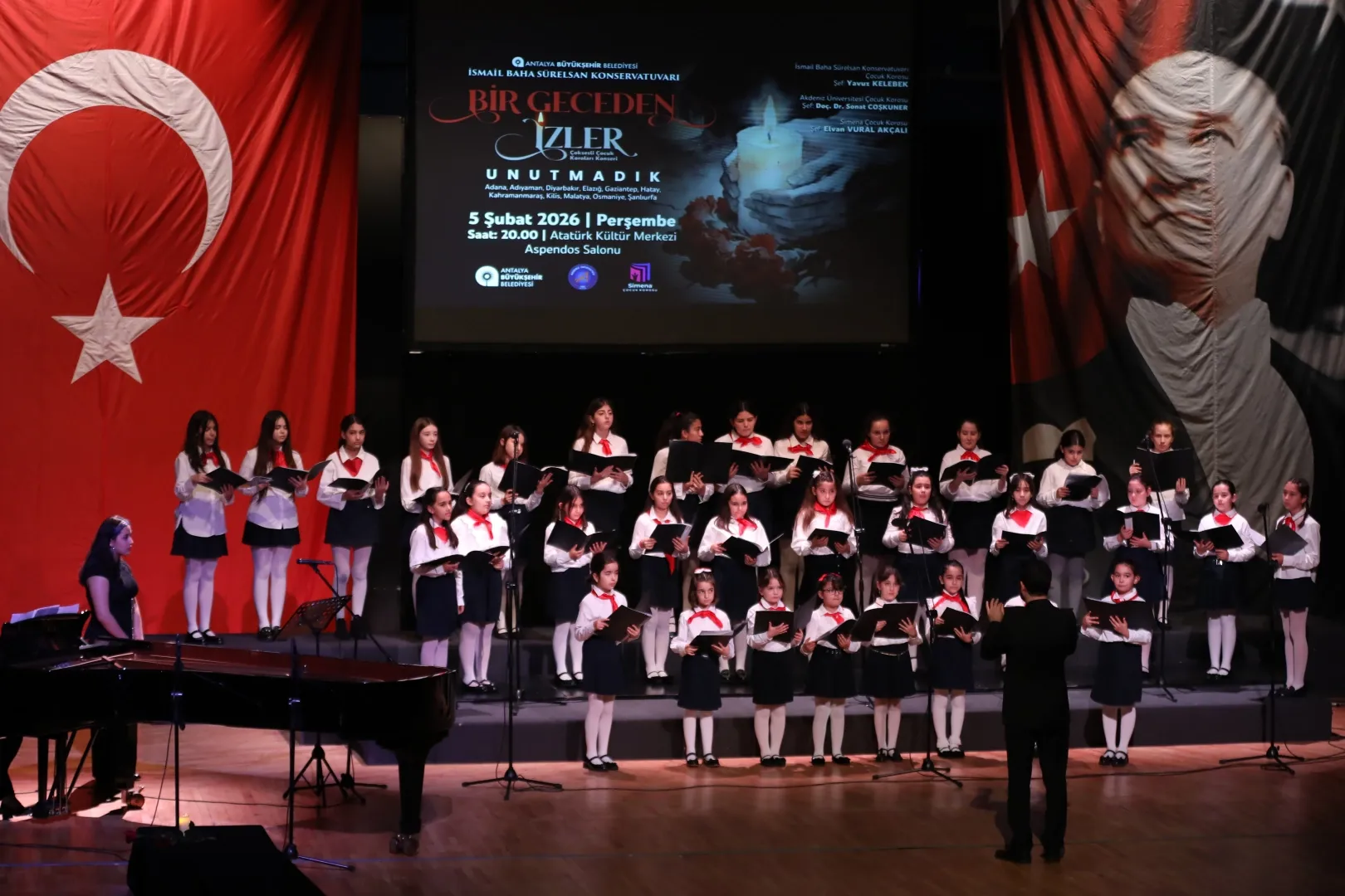 Antalya Büyükşehir Belediyesi İsmail Baha Sürelsan Konservatuvarı Çok Sesli Çocuk Korosu, 6 Şubat 2023'teki deprem felaketinde hayatını kaybedenleri özel bir konserle andı.