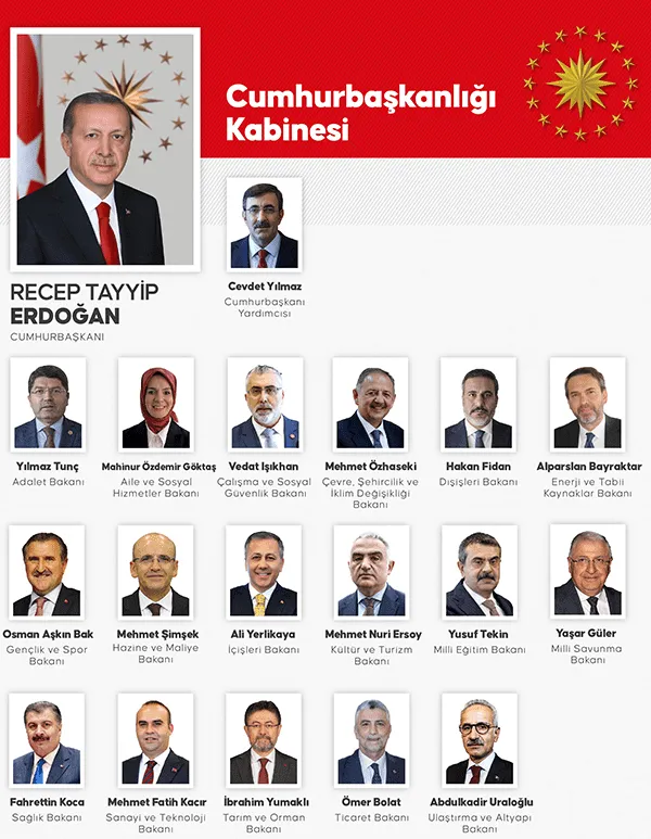 Merakla beklenen yeni kabine belli oldu, Cumhurbaşkanı ve AKP Genel Başkanı Recep Tayyip Erdoğan, kabinede bulunan isimleri açıkladı. Ekonomide merakla beklenen isim olan Mehmet Şimşek Hazine ve Maliye Bakanlığı'na getirilirken, İçişleri Bakanlığı'na eski İstanbul Valisi Ali Yerlikaya, Dışişleri Bakanı Hakan Fidan, Milli Savunma Bakanı ise Türk Silahlı Kuvvetleri Başkanı Yaşar Güler oldu.