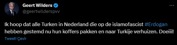 Hollanda’da aşrı sağcı lider Geert Wilders, Türkiye’deki cumhurbaşkanlığı seçiminin ikinci turunda Cumhurbaşkanı ve AKP Genel Başkanı Recep Tayyip Erdoğan’a oy veren Türklerin Türkiye’ye dönmesini istedi. Wilders, sosyal medya hesabından yaptığı paylaşımda, 'Güle güle' diye yazdı.