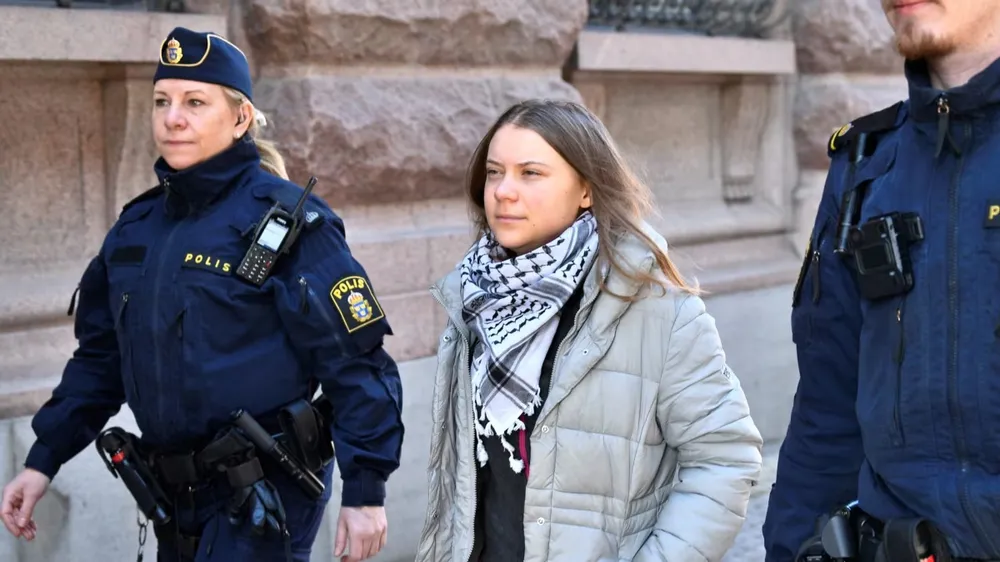 Ekstra Bladet haber kuruluşu tarafından yayınlanan Thunberg'in fotoğrafında, gözaltına alınırken kefiye şal örttüğü görülüyor.