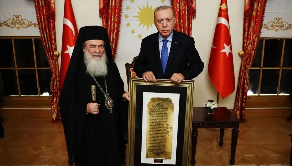 Kudüs Rum Ortodoks Patriği Theofilos Giannopoulos, Cumhurbaşkanı Recep Tayyip Erdoğan'a, Hazreti Ömer'in Kudüs'ü fethinin ardından Bizans İmparatorluğu adına şehri yöneten Patrik Sophronios'a verdiği emannamenin (güvence belgesi) yazılı olduğu tabloyu takdim etti.