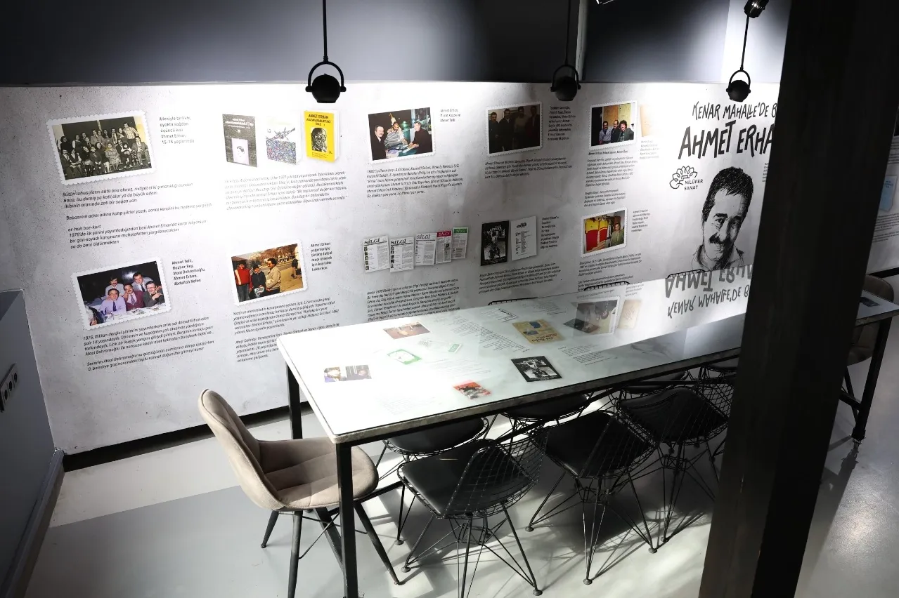 "Kenar Mahallede Bir Ahmet Erhan" sergisi, şairin dünyasına görsel bir kapı aralıyor. Sergide kitaplarının ilk baskıları, kişisel fotoğrafları, mektupları ve özel eşyaları sergileniyor. Ressam Habip Aydoğdu'nun kitap kapakları için hazırladığı akrilik taslaklar ile Vahit Akça'nın çizimleri sergiye ayrı bir renk katıyor.