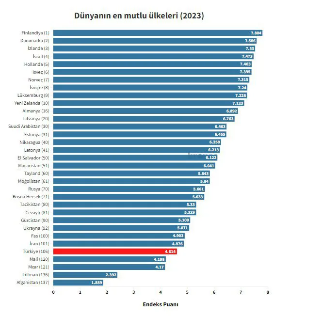 BM'nin 'Dünyanın en mutlu ülkeleri 2023' raporunun ilk 10 sırasında 4 İskandinav ülkesi yer aldı. Finlandiya'nın zirvede olduğu listede, Türkiye savaştaki Ukrayna'nın bile gerisinde yer aldı. Türkiye'nin bu düşüşünün sebebi olarak ise 'demokratik çöküş' gösterildi.