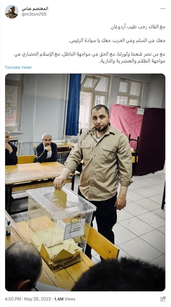 Suriye'deki cihatçı grupların liderlerinden Mutasım Abbas, pazar günü Türkiye'deki seçimlerde oy kullandığına dair bir fotoğrafını paylaştı. El Mutasım Tugayı'nın lideri Abbas, oy verirken Cumhurbaşkanı Tayyip Erdoğan'ı desteklediğini ifade etti.